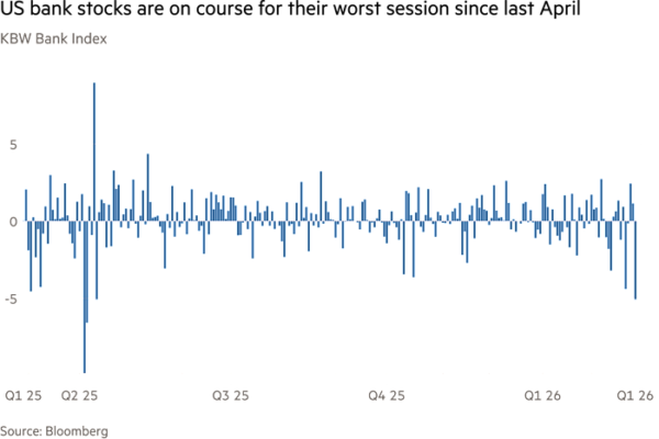 US bank stocks are on track for their worst sell-off since Donald Trump’s tariffs shook markets in April as concerns intensify around lenders’ exposure to a downturn in private credit sparked by AI disruption fears. The KBW bank index, which includes the largest US banks such as JPMorgan, Citi and Bank of America, fell 5.8…
