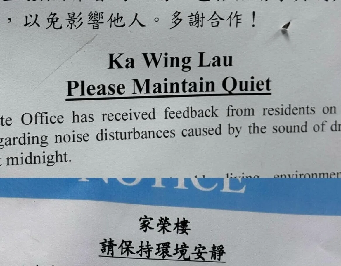 事緣近日有網民在Threads上載一張照片,只見一張估計是由管理處發出的英文版通告上,提到「Ka Wing Lau Please maintain Quiet」,意即保持安靜,惟該網民最初大感不解,為何指名道姓地叫「Ka Wing Lau」的居民保持安靜。惟其後才得知「Ka Wing Lau」的廬山真貌實為位於家維邨的家榮樓。該網民表示,一直以為「樓」應該是estate或者house,想不到竟然譯作Lau,直呼是長知識。