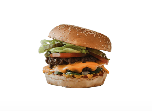 If you go for a Smashburger Double Classic Cheeseburger, it’ll cost you about 970 calories, 62g of fat, 27g of saturated fat, and an extravagant 2,360mg of sodium. The burger is made with two Certified Angus Beef patties, American cheese, and toppings and although the sodium is a bit shockingly high, that Smash sauce almost makes it worth it.
