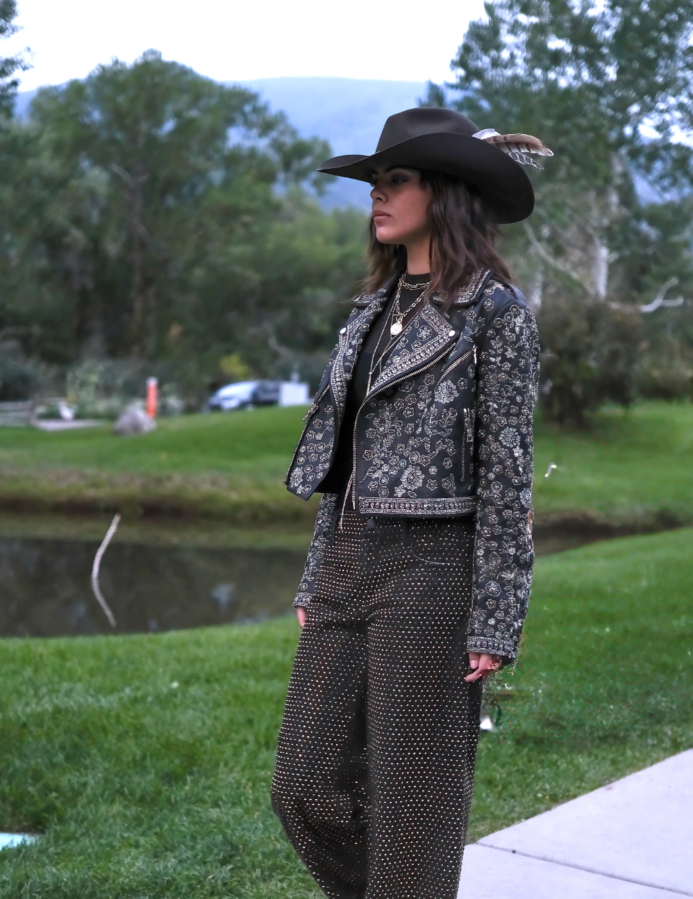 At alice + olivia, you can’t have Aspen Fashion Week without a cowboy hat. These looks are the definition of country chic and the perfect inspiration for your next country concert or festival look. The mix of frill, metal accents and leather in these outfits make a standout display that will be sure to turn heads. The floor-length blue gown embroidered with wildflowers and mushrooms is our pick for the star of this show, paired with a cowboy hat adorned with some feathers and chunky silver bracelets.