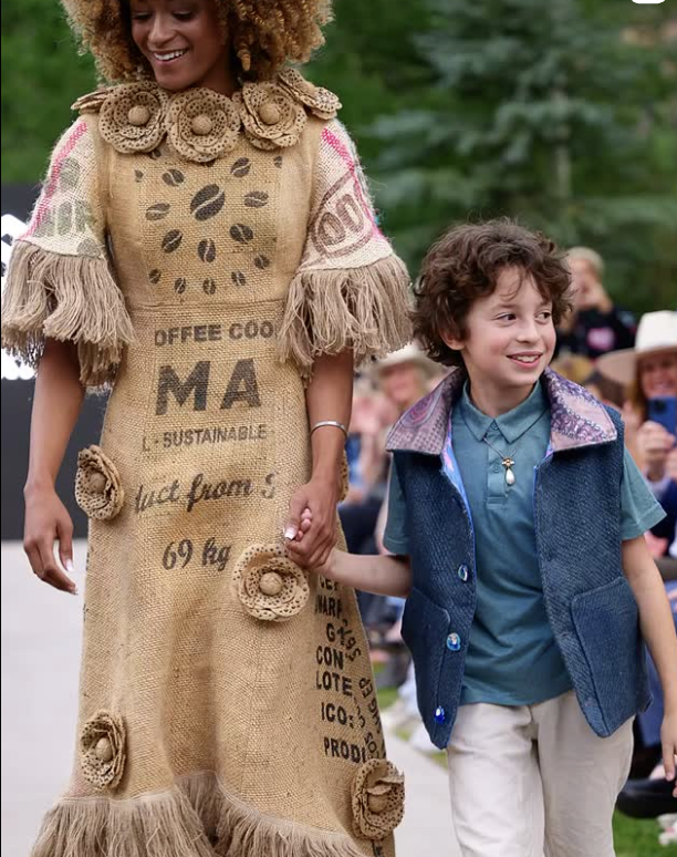 Nine year-old Max Alexander brought looks to AFW that prove he is wise beyond his years. These dresses made from up-cycled coffee bags are the perfect mix of rustic and chic. The brown burlap fabric complimented with painted designs and a stunning olive green cape show how sustainability is fashion-forward. If a young kid like Max can bring these gowns to life using recycled materials, I think some high fashion brands might need to take a page from this young runway designer’s book.