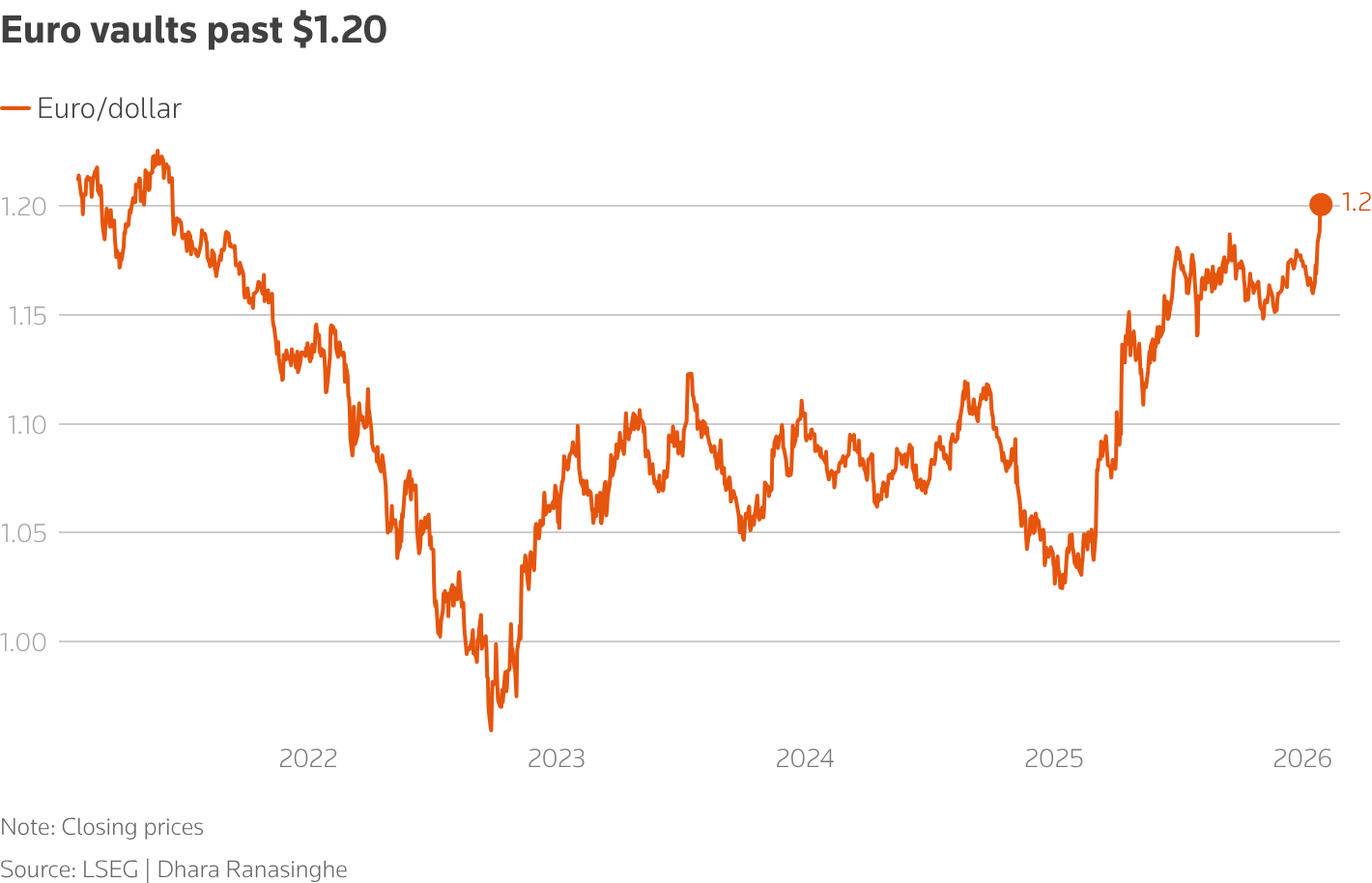 The weaker dollar filtered through to other assets, helping gold strike a record above $5,380 an ounce and benchmark Brent crude futures to hit a four-month high just above $68 a barrel.