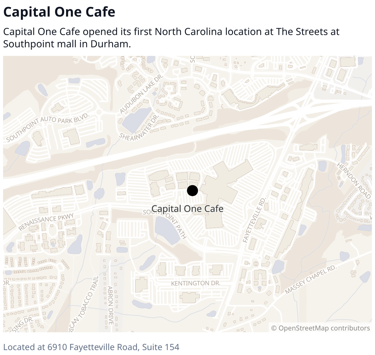 Capital One Cafe has opened its first North Carolina location at Durham’s The Streets at Southpoint.