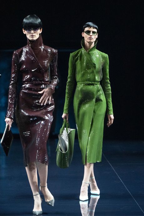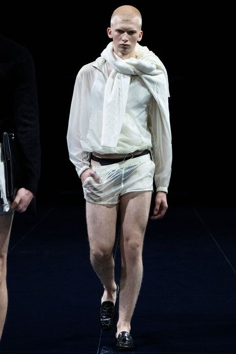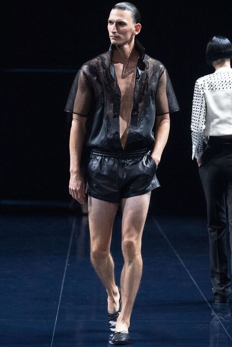 Ackermann gave an extremely high-styled presentation for Ford, on a flat, glossy black runway, the models striding slowly out in twos and threes, and looking almost untouchable, alien goddesses in blunt helmet cuts or slicked back hair. The male models often seemed like their drones, or at times, in tiny shorts with visible black jock straps and comfy ballet slippers, like a coterie of their own. In Ackermann’s vision, the men seem to have more freedom than the women. Some were wearing shorts and elegant dinner jackets, or a relaxed suit in a neutral tone, while the women got sleek, fitted coats, satin pantsuits in saccharine apple green and turquoise, and, in one or two cases, evening dresses made of little more than tight suspension cords and patches of fabric (a look Ackermann has done in the past for his own label). And the guys got the ballerinas while the girls got stilettos.