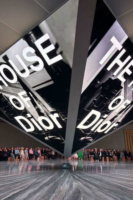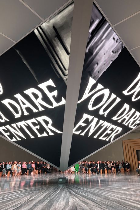 That feeling was about to be disturbed. A large inverted pyramid dominated the center of the room, extending from the ceiling to a few feet above the polished gray floor. They were screens, a stylish jumbotron; and once the lights dimmed, on them appeared the title of a video in a horror-movie font: Do You Dare Enter the House of Dior.