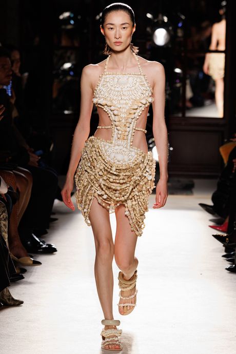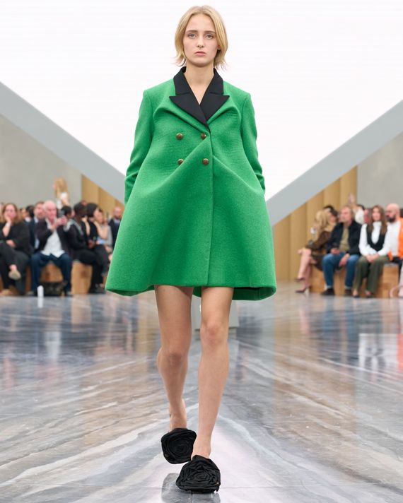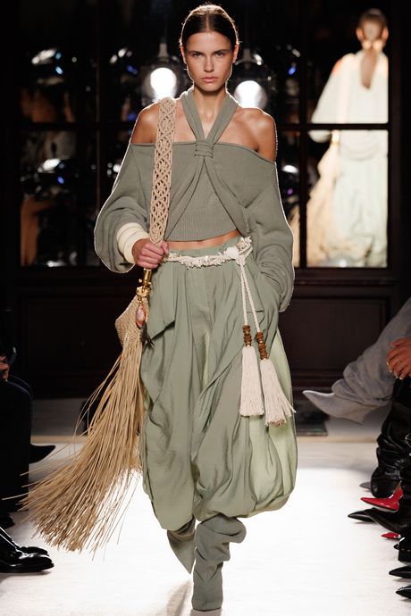 Olivier Rousteing has adjusted the fit and silhouette of Balmain as he’s needed over the past decade or so, and this season he went a lot softer and looser with the shapes. He said he imagined “the endless horizon of a beach.” Unfortunately, that was the effect of his many draped parachute pants, bomber jackets, and cotton sweaters in khaki, sand, and rust tones, some garments embroidered with clacking shells — in case you missed the point.