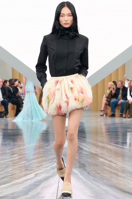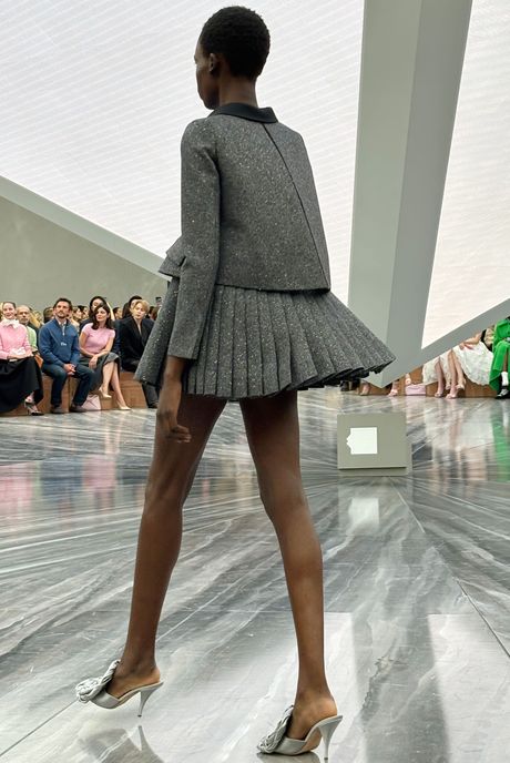 He provided multiple ways, for different ages and personalities, to enter the collection. And yet it still bore the imprint of Dior, particularly in the use of (light) floral embroideries and trims, like a pair of white hydrangea blooms in silk tucked into the gathers of an evening dress and finished with thin black streamers. His knitwear was imaginative, and included easy, form-fitting shapes as well printed mini-pouf skirts with a fuzzy, dry texture. He put movement in a lot of the short dresses and full skirts, using very light boning or gathers at the back. Again, the attitude was more ironic and playful than serious. And it made for a great line in profile. The black hats, by the milliner Stephen Jones and inspired by nun’s caps, also did their work. As the video showed, millinery is a long and sometimes sugary story at Dior.