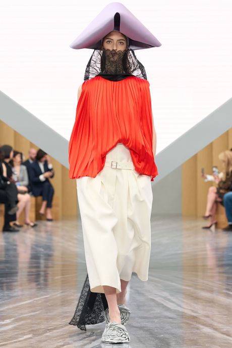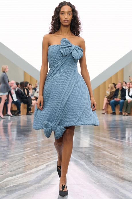 In a way, Anderson has forced a pause with this collection, which felt more complete and progressive than his first offering, for men, in June. He is asking a house and its customers, used to princess gowns and tweaked renditions of the famous Bar jacket, to accept, instead, a short dress with a teacup skirt in cream, pale-pink, or dusty-blue bias-pleated silk. Or a shrunken version of the Bar with a miniskirt that extends out at the back. Or a flowing top in pleated, deep-red silk satin with a high collar of black lace that unfurls in streamers down the back and was shown with extremely wide-leg white trousers.