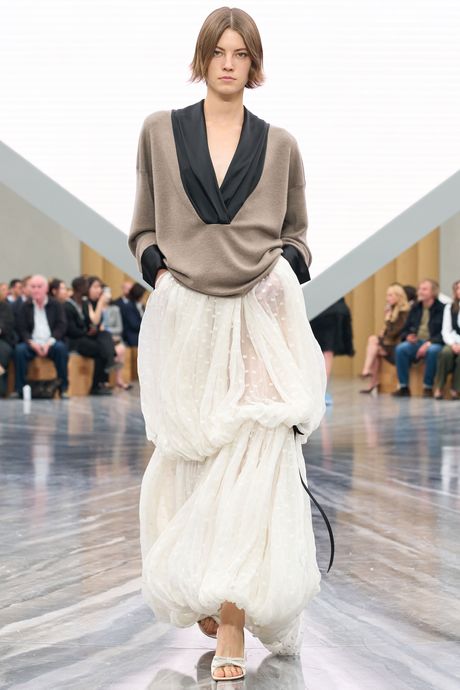 What Anderson gets right is that Dior can lead by provoking change, and by acknowledging that people want lighter clothes that are mobile in style, and knowing but not pretentious. He broke up many of the looks — meaning that he often paired, say, a black dinner jacket in a blend of silk and mohair with a casual miniskirt. A long, tiered bubble skirt in white Swiss dot came with a beige wool tunic with a deep V-neck traced in a wide black band. It was terrific as a less fussy evening look, or if a woman didn’t see herself in a bubble skirt, she could wear the top with pants. That flowing top with the black-lace collar? He showed the top in three different colors, and you could wear it with tailored black pants.