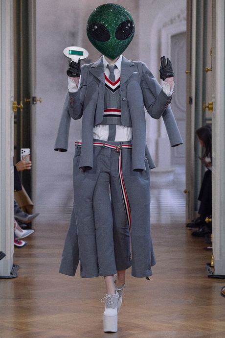 “I wanted to just play and have fun,” Browne said after his show, in the elegant former residence of Karl Lagerfeld. The first model out had on a green helmet, like a sci-fi alien’s bug-shaped head, and wore a tailored jacket and skirt with multiple dangling sleeves stiffened into pipes. Each carried a digital device — it reminded me of a doctor’s temperature reader — that flashed with the number of the look. Meanwhile, the refrain of the soundtrack occasionally murmured a kind of mmmm. It was taken from Toy Story, though I thought E.T.
