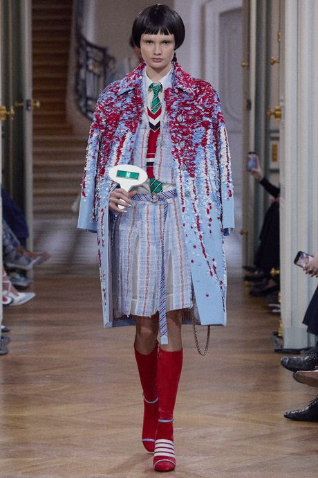 We were definitely on Browne’s planet. My other thought was that if you take off the helmets, unstuff the extreme show pieces, and whittle things down, you get some lovely, fresh-looking clothes. Some of the embellished and slightly frayed coats were terrific, but more enchanting were Browne’s neat, small jackets with pleated skirts in ultralight combinations of classic fabrics. The sheer bodysuits were embroidered with images of physiques. He also showed new sock-and-sandal boots in various spring colors.
