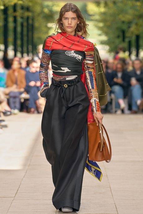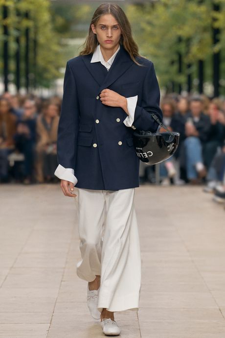 So it was at Miu Miu on Monday, with the actress Sandra Hüller dressed in cotton twill for factory duty. Prada has long been intrigued by uniforms, all kinds. Does it seem hypocritical for a luxury brand to present the kind of ordinary clothes and accessories — smocks, floral cotton tops with ruffles at the armholes layered over a sweater, drab leather jackets, leather belts with D-rings for tools or keys — that someone working in a nearby market stall might wear? Perhaps, but fashion has a history of borrowing from the working classes. Gabrielle Chanel did it. Fashion is a curious magpie. But the apron story here was too literal, not to mention repetitive. Aprons also appeared last month in the Eckhaus Latta collection, subtly and to better effect.