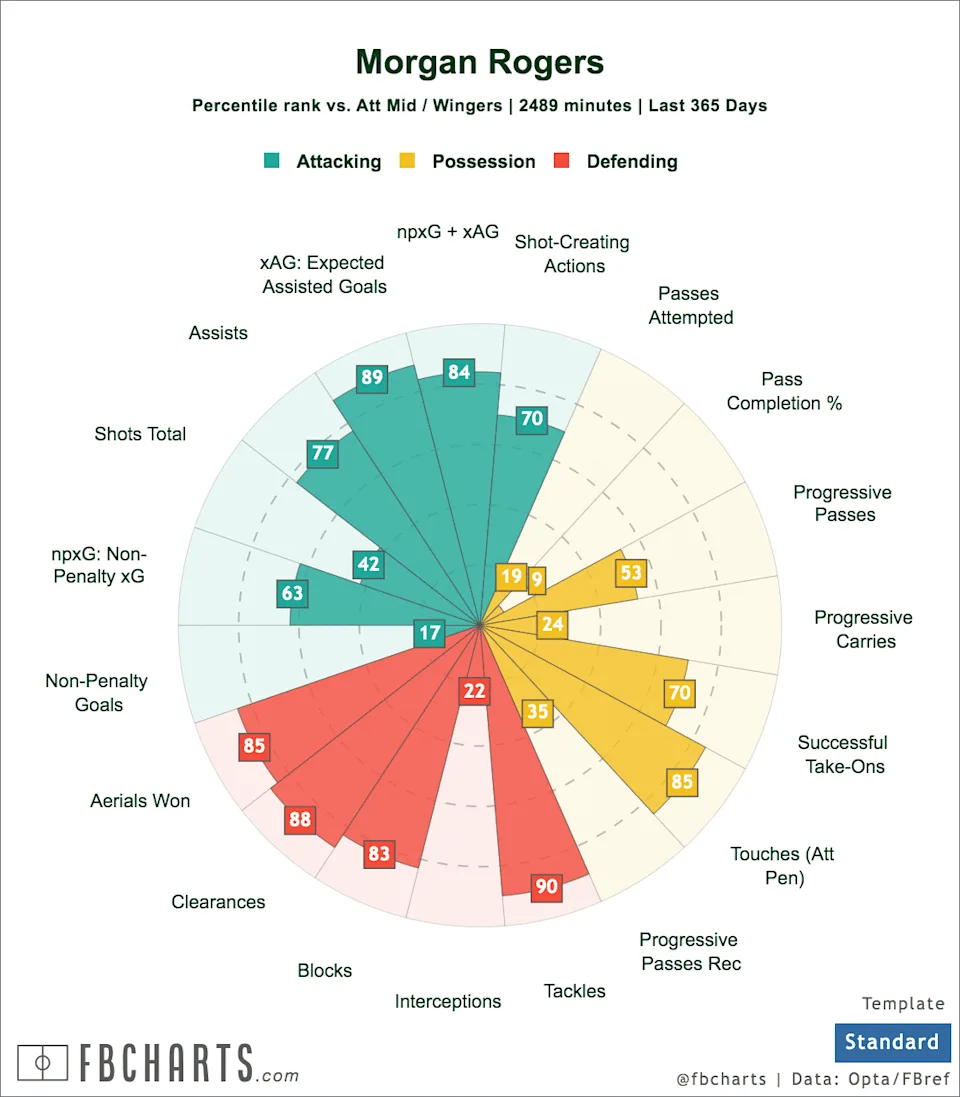 Morgan Rogers’ rise has been steady rather than explosive, but his output this season has elevated his standing across recruitment departments. Five assists across 26 appearances only partially reflect his influence, with data metrics highlighting his progressive carries, duel success and chance-creation involvement.