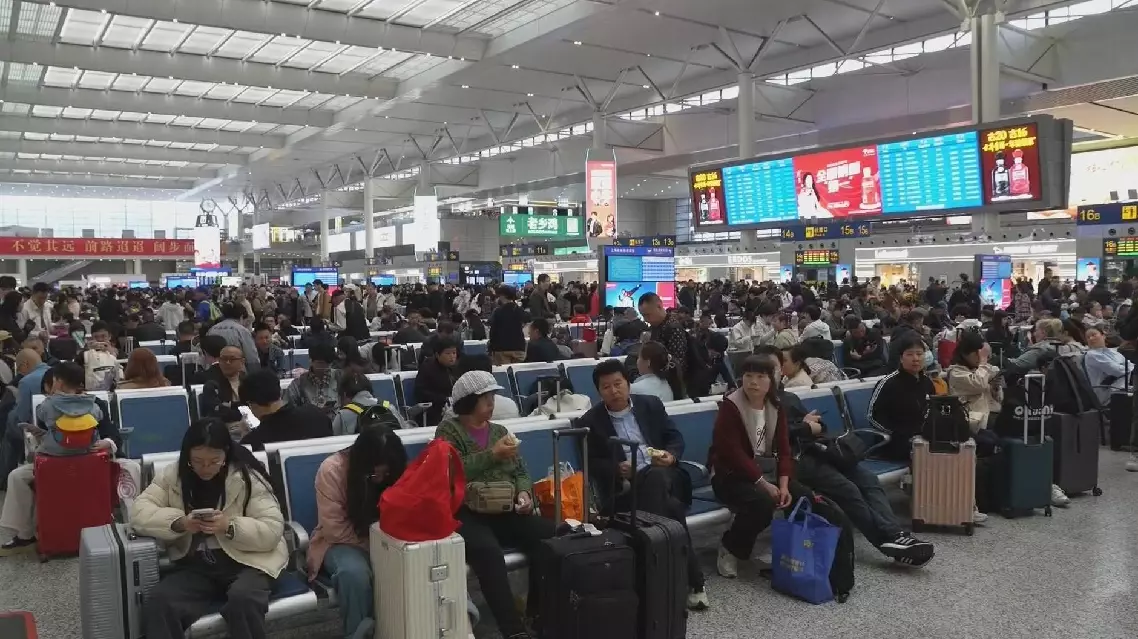 “I’m just passing through from Zhejiang (Province). Since schools there are on spring break, I’m taking my kid to travel. We set off early, because if we wait until the May Day holiday, the 1st and 2nd of May would be way too crowded,” said Yan Meng, a passenger at Nanjing Railway Station.