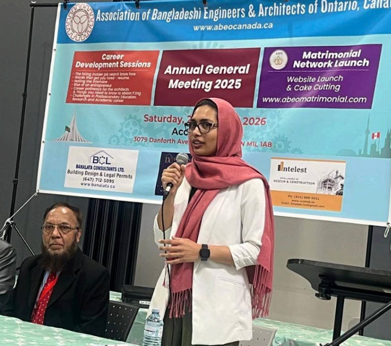 Beyond the campaign, The Bureau confirmed that Talukder’s relationship with Begum extended into community settings. He serves as president of the Association of Bangladeshi Engineers and Architects of Ontario (ABEO), a 1,500-member professional organization incorporated in 1997. The Liberal campaign statement said Begum attended what was advertised as a career fair hosted by the association and had no knowledge of any matrimonial network associated with the event, and that she has no ties to the network.