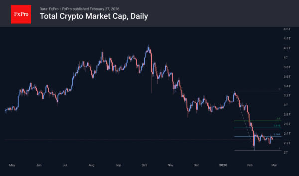 Over the past three weeks, the market has mainly traded within the $2.20–2.40 trillion range. Local resistance roughly coincides with a 23.6% recovery from the decline between the mid-January highs and the early February lows. Such narrow consolidation is often seen in strong bear markets.