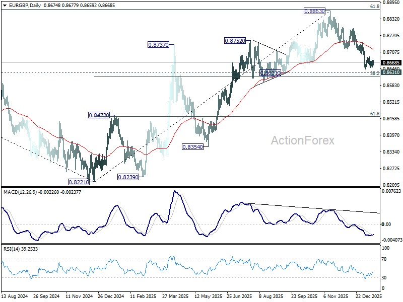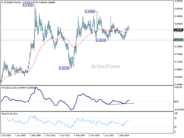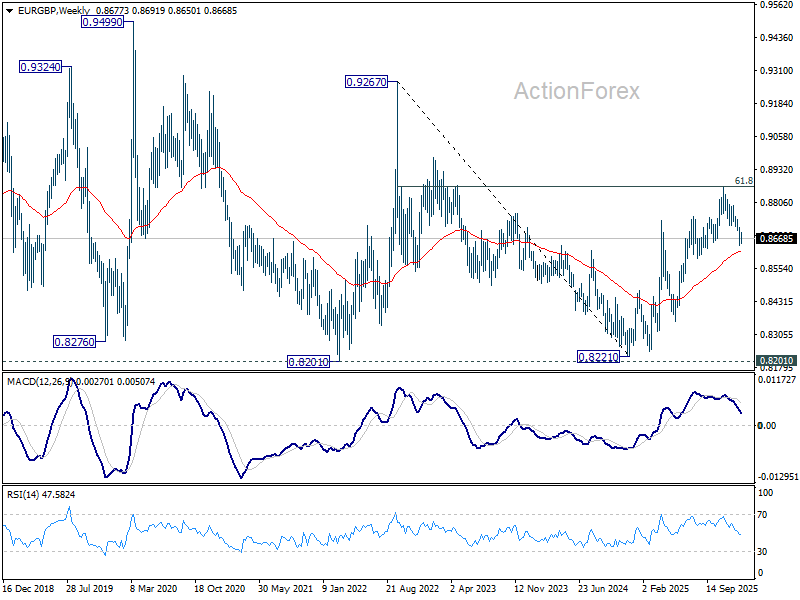 In the bigger picture, rise from 0.8221 medium term bottom (2024 low) is seen as a corrective move. Upside should be limited by 61.8% retracement of 0.9267 to 0.8221 at 0.8867. Sustained trading below 55 W EMA (now at 0.8622) should confirm that this corrective bounce has completed. In this case, deeper fall would be seen back to 0.8201/21 key support zone. However, decisive break of 0.8867 will suggest that EUR/GBP is already reversing whole decline from 0.9267 (2022 high). That should pave the way back to 0.9267.