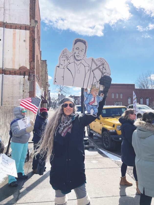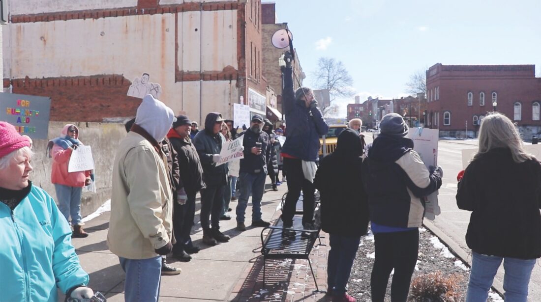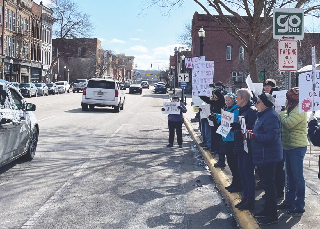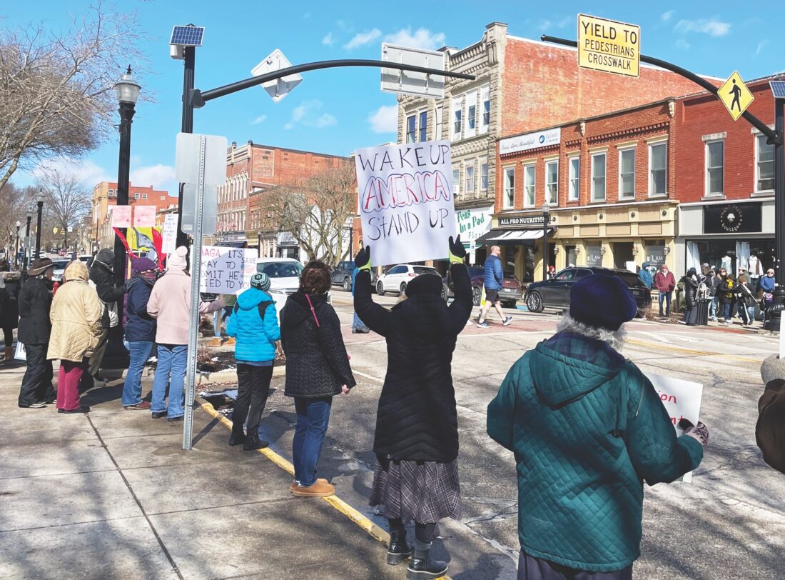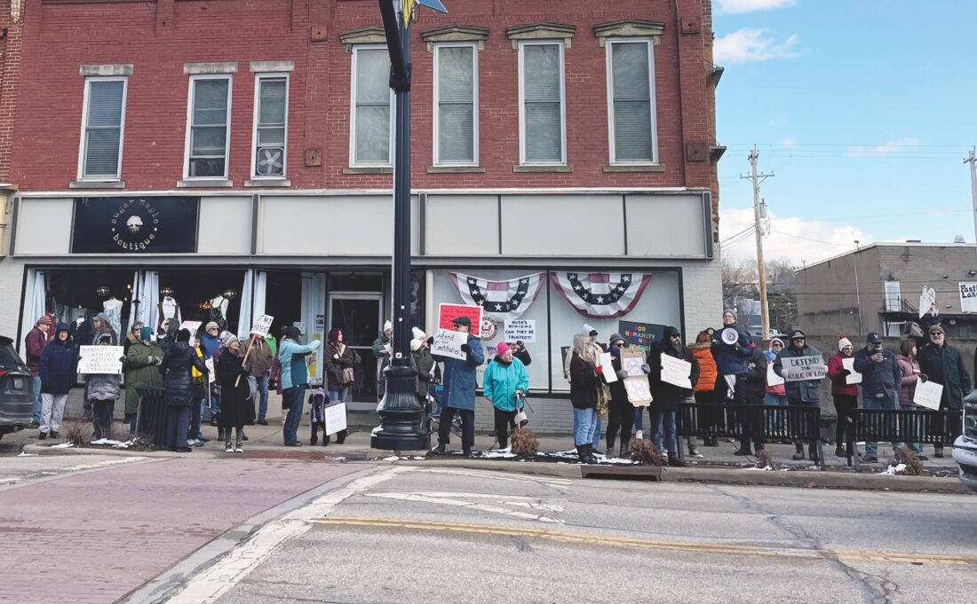 Despite the cold, over 100 protestors lined Front Street by the Armory and U.S. Rep. Michael Rulli’s office to protest actions taken by the current presidential administration on Monday afternoon in Marietta.