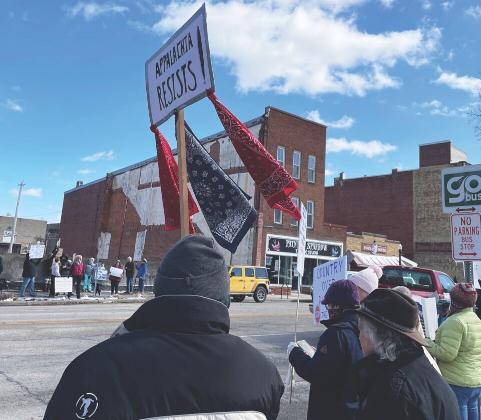 Mark Vanzanten waves a sign that reads “Appalachia Resists” during a protest in Marietta Monday afternoon. The sign has bandanas attached to it, a reference to the bandanas worn during mine strikes by coal miners in the early 20th Century.