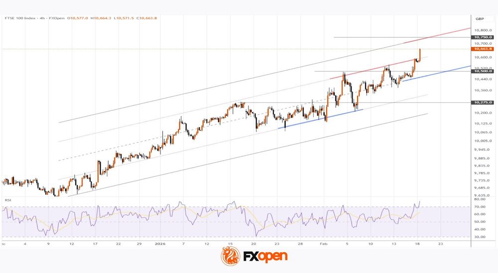It is reasonable to assume that bullish sentiment will continue to dominate the FTSE 100, with 10,750 — near the upper boundary of the long-term channel — potentially serving as a target for profit-taking.