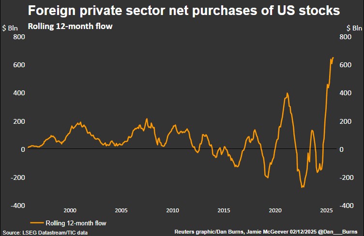 But the available evidence shows that, despite all the U.S. economic, political and policy turbulence in 2025, foreign appetite for U.S. stocks has never been stronger.