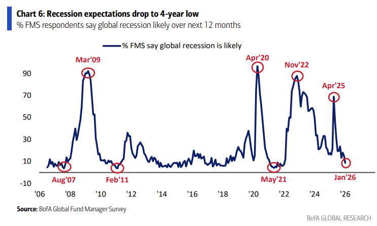 That macro view was amply reflected in the survey’s relative asset holdings, with the net number of funds overweight stocks also close to 50% and the highest since just after the U.S. election in late 2024. Overweight holdings of commodities were their highest in more than three years and cyclical bank stocks were the most favored sector.