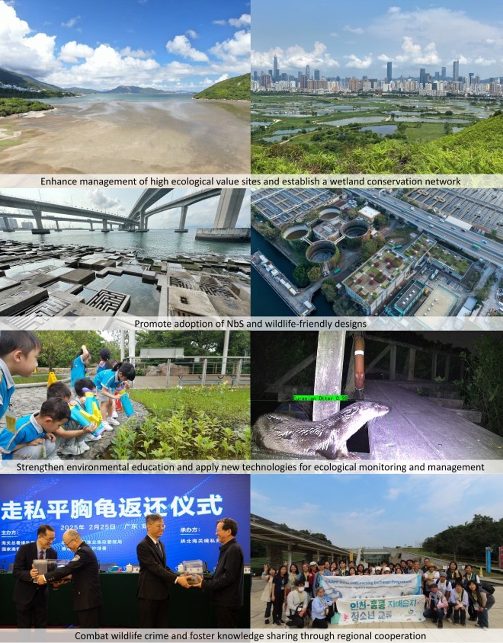 Example priority actions include strengthening management of high ecological value sites outside protected areas (e.g. Shui Hau and Sharp Island) and establishing a wetland conservation network (including the Sam Po Shue Wetland Conservation Park), to reinforce protection of critical habitats and enhance habitat connectivity.