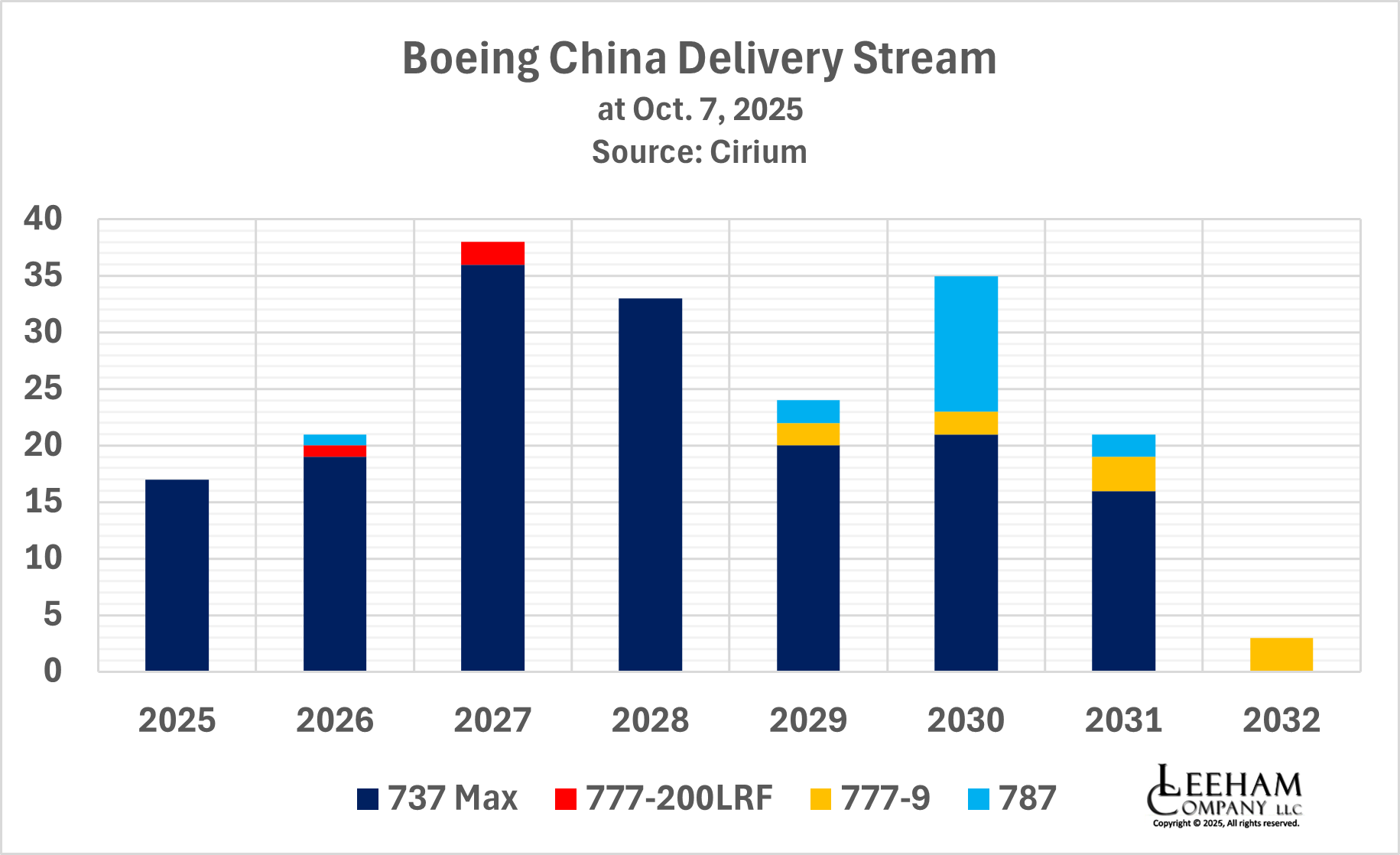 There was initial hand-wringing among some media that blocking deliveries would hurt Boeing. However, when Boeing’s delivery stream to China for the balance of Trump’s current term (which ends on Jan. 20, 2029) is examined, it’s clear that, while annoying, Boeing actually has few airplanes scheduled for delivery.
