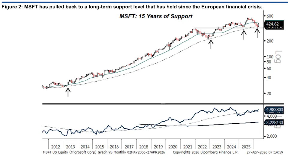 He added that Microsoft can be “owned both fundamentally and technically,” given the recent pullback to a long-term support level (see chart below) that has held since the European financial crisis.