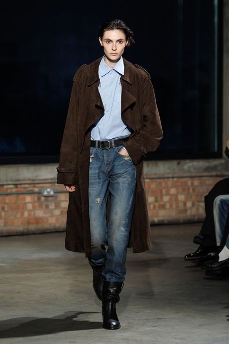 Finally, last night, the luxury fog lifted and Daniel Lee got real. We were in an open-air tent on the edge of Kensington Park with a packed-dirt runway and wooden block seats. Black Sabbath was on the sound system. With the first three looks — a green-and-orange plaid mini-coatdress, a denim trench with a light sheen, and a white crochet-knit shift — it was clear that Lee was stripping things back, going younger. Within a dozen looks, he had offered his version of a wardrobe: a terrific-looking skinny suit with slightly cropped trousers and a striped shirt, a lightweight classic trench (hooked over an arm and treated as an accessory), a brown leather car coat with fringe at the cuffs, and jeans.