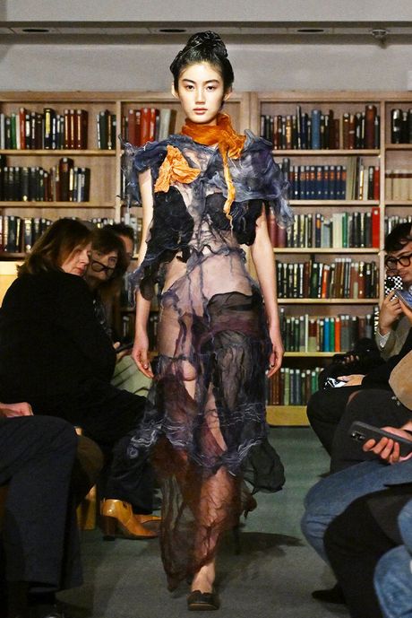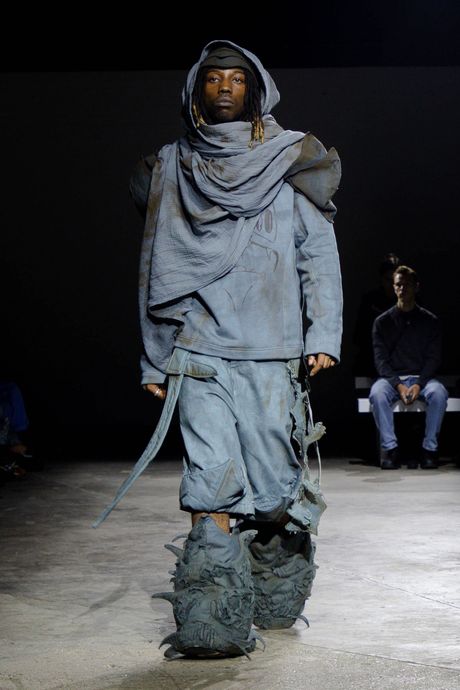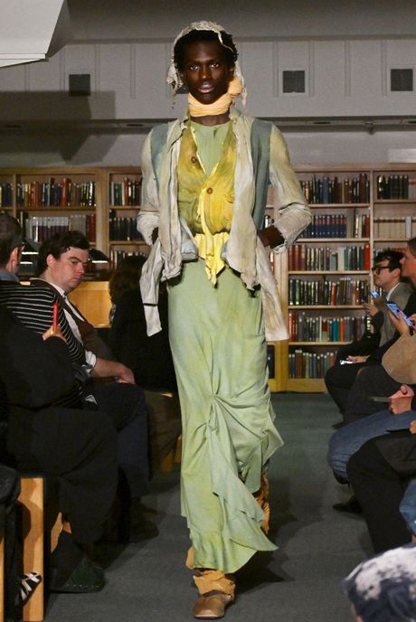 A few young designers refined their style and storytelling, notably Paolo Carzana and Yaku Stapleton of the brand Yaku, both of whom have been supported by Paul Smith’s Foundation. Some of Carzana’s spare, gauzy dresses, in rich shades of blue, purple, and green, were breathtaking. One of his obsessions is to achieve the supernatural colors of the earth, and he did so with substances like salt, vinegar, seaweed and other plants. Yaku was a performance piece with about 15 models arriving skeptically at a make-believe place and becoming friends. Sounds like White Lotus? Hardly. Stapleton’s designs have a dystopian quality with oversize pants with ragged bits, camouflage elements, and moon boots that looked thickened with fabrics bits. But the clothes are nearly all commercial.