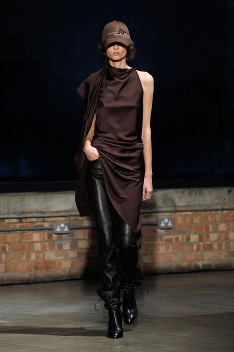 Watching Burberry in the park, I thought of Aaron Esh, a young designer whose show on Saturday night in a clubby venue in the East End had exactly the same values. In fact, I thought a lot about Esh’s show over the weekend, in a remarkably strong London season. Without Lee’s need to be on-brand, Esh was free to make a wardrobe-based collection that was more authentically cool and personal. Among the standout looks were a bespoke suit in pale lilac mohair, trim bombers in leather or satin with wide waistbands (in creamy white with a slim matching skirt as a downbeat dress-up look), a safari jacket in rust-red suede, and a bias-cut, one-shoulder tunic in dark-brown jersey with black leather pants.