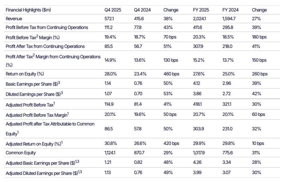 Net trading income increased by $163.7 million to $291.8 million (Q4 2024: $128.1m), underpinned by Agency and Execution (+$99.9m). Growth reflected the continued scaling of Prime and growth in FX, including the integration of Hamilton Court alongside improved performance in Equities and Credit. Net trading income growth was also supported by Solutions (+$39.4m), which had a strong performance across both Financial Products and Hedging Solutions and Market Making (+$18.7m) as Metals performed strongly.