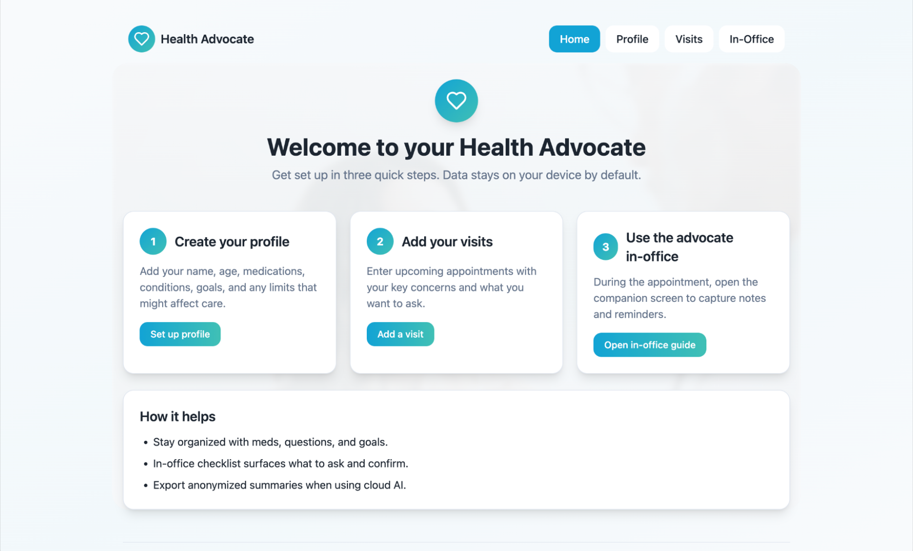 Health Advocate helps users organize their medicine, develop health goals, organize health concerns before they see a doctor, and take notes during a doctor’s visit. The app also creates a checklist of questions users should ask during doctors’ visits and uses a cloud-based AI system to generate anonymized summaries.
