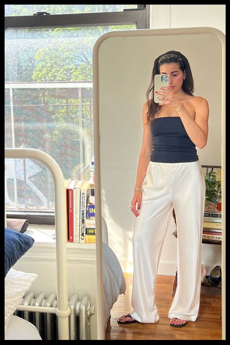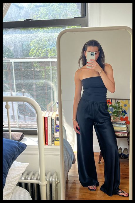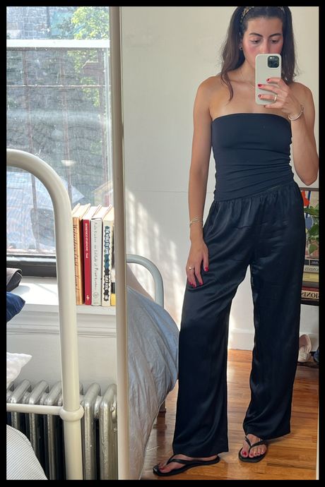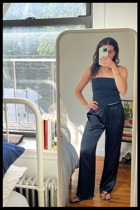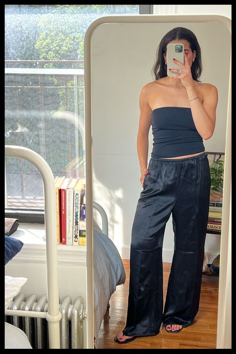 With a season of birthdays, art and fashion invitations, and a trip to Amalfi on the horizon, I began my search for a pair of slinky pants that I could basically style with my eyes closed. I wanted something black (or another neutral shade), baggy, and (in an ideal world) made 100 percent of a natural fiber (mainly silk) for $300 or less. Specifically, I was looking for pairs with elastic and drawstring waistbands — to be worn either high or low waisted, comfortably enough for hours on end — and a wide-leg, flowy, bias-cut variety, with an inseam bordering on too long, which would create a flattering pooling of fabric at the ankle. (For reference, I’m five-seven and typically a size small — pants being too long is hardly ever a problem.) Finally, I was well aware this style of pants is not for the low maintenance. Whether silk or satin, they’re delicate, prone to wrinkles, and often require dry cleaning. While this was not an issue for me, I still hoped to find a pair that wouldn’t show too many wrinkles if I skipped steaming and that showed only minimally visible panty lines.