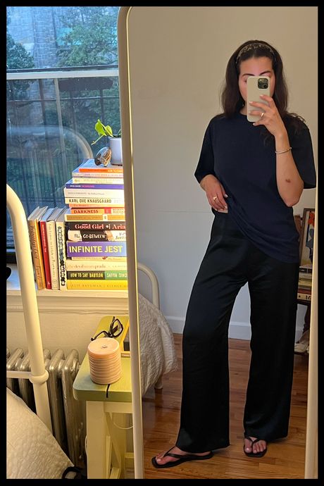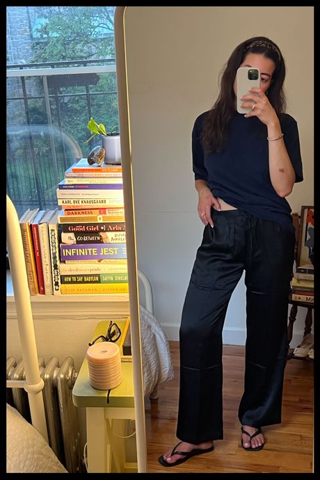 It all began in March, at a Friday-night showing of the thriller Black Bag, in which an auburn-wigged Cate Blanchett, playing a charming spy named Kathryn, floats in and out of scenes dressed in swaths of silks and satins. I couldn’t shake visions of her character’s wardrobe — especially a dinner-party look she wears early on in the film, involving what appeared to be swishy slip-on satin pants. The more I thought about it, the more I realized that I lacked a pair of “staple” bottoms I actually enjoyed wearing — pants that made me feel proper and posh but could infuse my most casual, daily looks with some effortlessness and elegance. Beyond the 20 or so pairs of jeans stacked in my closet, there wasn’t one pair of trousers, particularly black ones, that I could depend on to carry me through what my 10- to 12-hour days often amount to: some work, some play, and several dress codes.