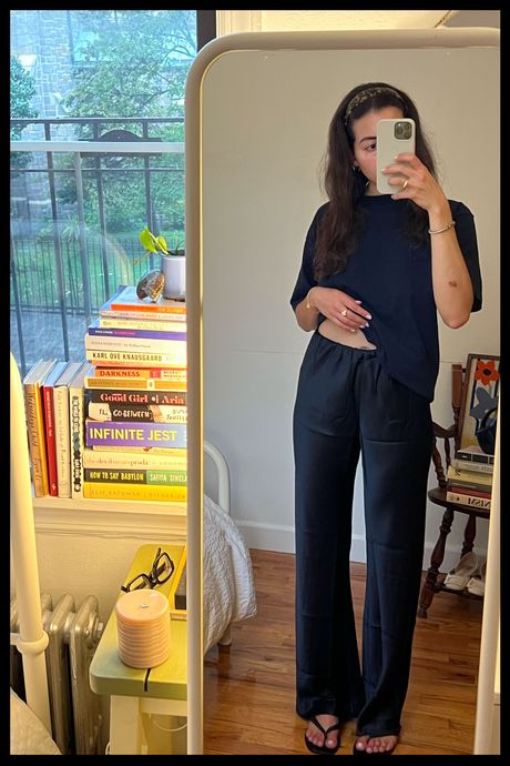 I innocently decided to test these pants for what was supposed to be a nine-hour flight to Naples back in July, thinking they’d make for a comfortable yet chic airport look. Little did I know they’d be one of three articles of clothing to my name for the next 36 hours, after being stuck at Newark airport for 12 hours’ worth of delays, boarding a six-hour flight to Paris at 3 a.m. without my checked bag, a layover at Charles du Gaulle for six more hours, then boarding another flight to Naples and arriving at 10 in the evening without any other clothing. I was only able to finally put these to rest after retrieving my suitcase at Naples International the next morning. Not only did they deliver on being very comfortable, but I found they perfectly towed the line between elevated everyday and elevated formal. The waistband is very slim, and the hems are finished off with a charming pajama-pants-like stitching, similar to Donni’s pair. I’m wearing these pants as I write this now, but have also been able to wear them on train rides to and fro upstate, with backless tops and vintage stilettos, and to the bank to grab cash, all while feeling that sense of elevated ease I’d long been chasing after from pants. And though other pairs came very close to replicating this feeling, and are still part of my weekly rotation, I continually wear these out most, their length long but not too long (perfect for flip-flops), and heft somewhere between that of the Colby and a natural silk.