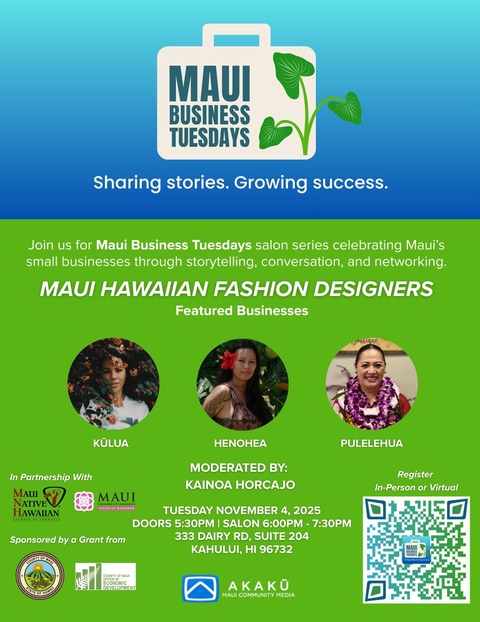 The debut salon in Akakū’s new Maui Business Tuesdays series will spotlight three Maui Hawaiian fashion designers — Anna Kahalekulu of Kūlua, Courtney Lazo of Henohea Hawai‘i, and Gemma Alvior of Pulelehua Boutique. The salon will be moderated by Maui Native Hawaiian Chamber of Commerce President Kainoa Horcajo.