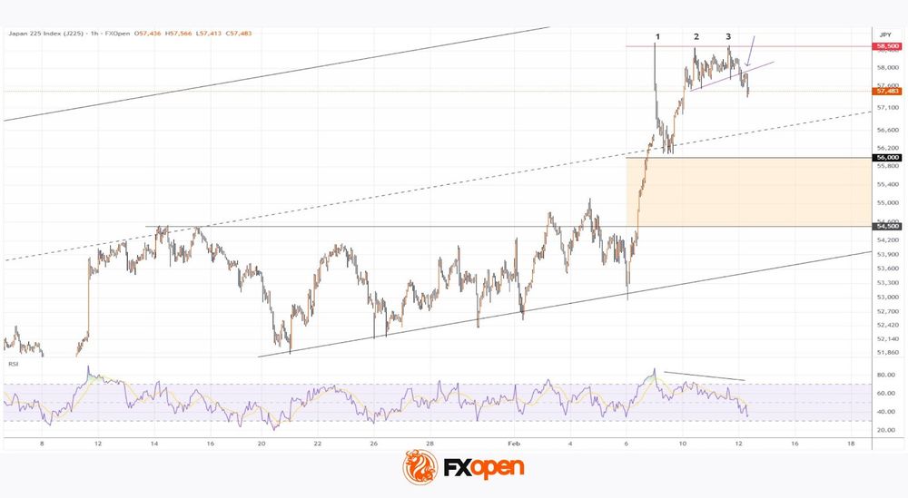 As the chart shows, the Nikkei 225 index (Japan 225 on FXOpen) reached a historic high near 58,500 points on Monday. Bullish sentiment was driven primarily by political developments.