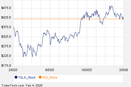Among the underlying components of the S&P 500 index, we saw noteworthy options trading volume today in Tesla Inc (Symbol: TSLA), where a total of 1.8 million contracts have traded so far, representing approximately 176.3 million underlying shares. That amounts to about 285% of TSLA’s average daily trading volume over the past month of 61.8 million shares. Especially high volume was seen for the $420 strike call option expiring February 04, 2026, with 62,529 contracts trading so far today, representing approximately 6.3 million underlying shares of TSLA. Below is a chart showing TSLA’s trailing twelve month trading history, with the $420 strike highlighted in orange: