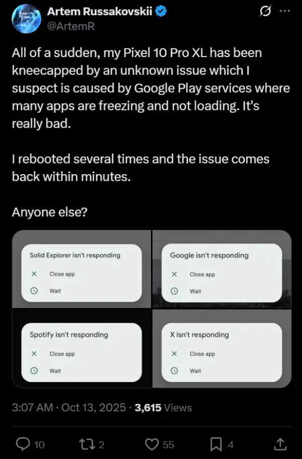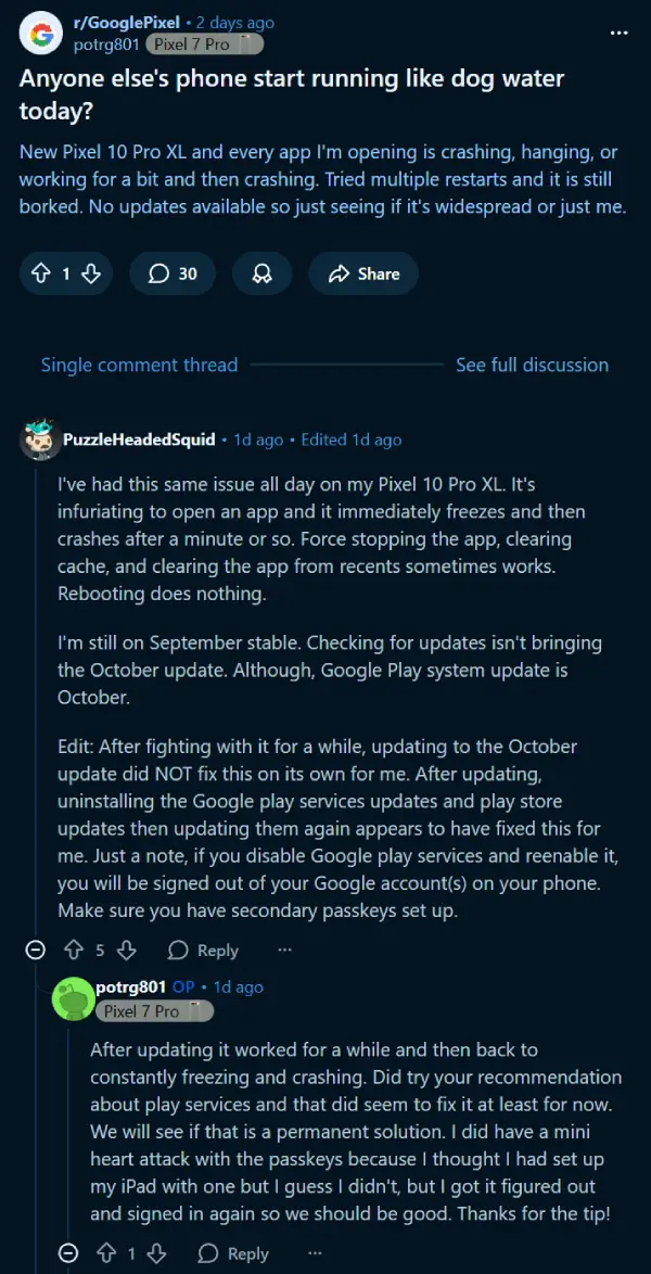 The problem isn’t limited to just one Reddit thread either. Another discussion from two days ago shows similar complaints from Pixel 10 Pro XL owners, with users describing their phones as “running like dog water.” Multiple restarts did nothing to fix the crashes, and apps continued hanging or freezing regardless of what users tried.