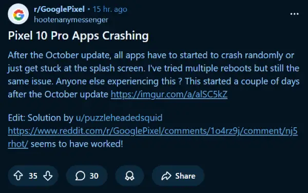 One user on the r/GooglePixel subreddit described apps crashing randomly or getting stuck during launch, even after trying multiple reboots. The thread quickly filled with similar complaints from other users experiencing the same problems.