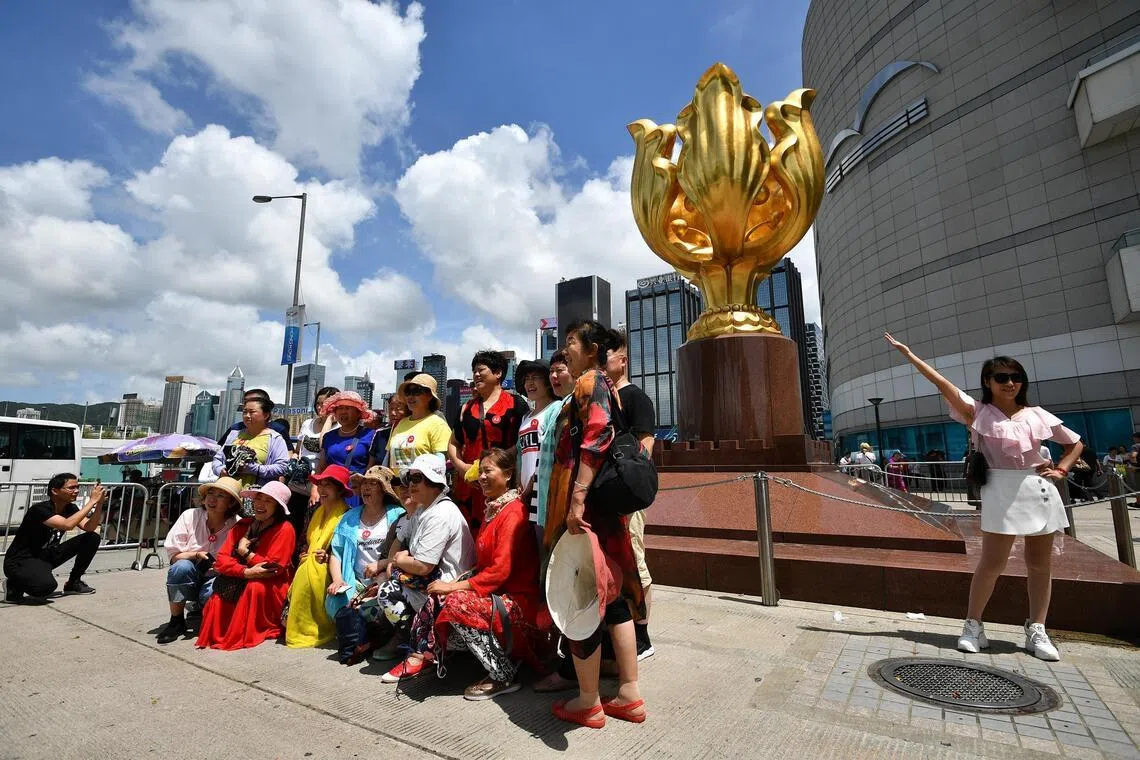 Chinese tourists taking photos with the Forever Blooming Bauhinia sculpture at Golden Bauhinia Square in Wan Chai, Hong Kong. The 6m-tall gilded bronze sculpture, gifted by China to celebrate the 1997 Handover, has become a popular landmark.