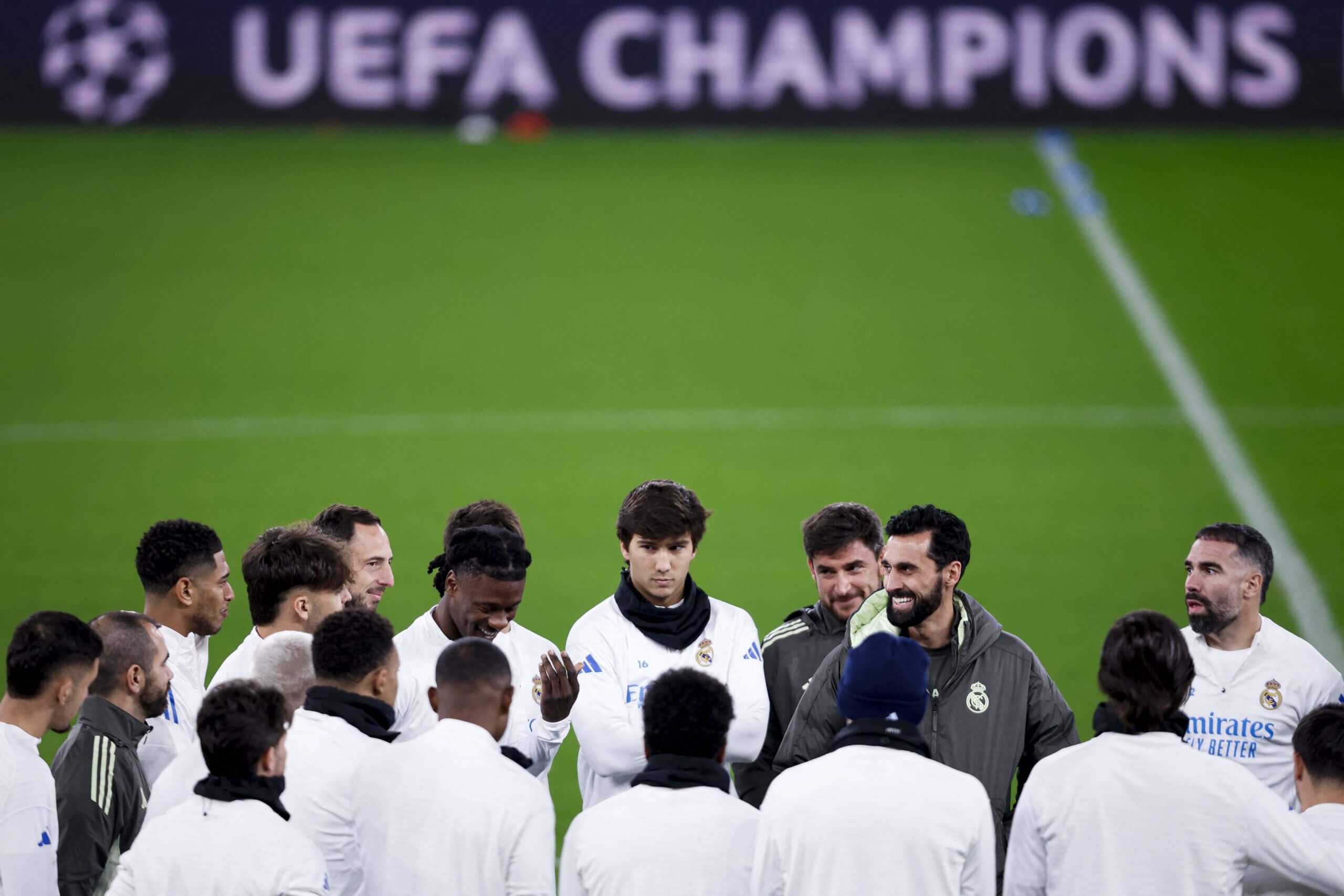Arbeloa and the Madrid team in training before last week’s Benfica defeat (Filipe Amorim/AFP via Getty Images)