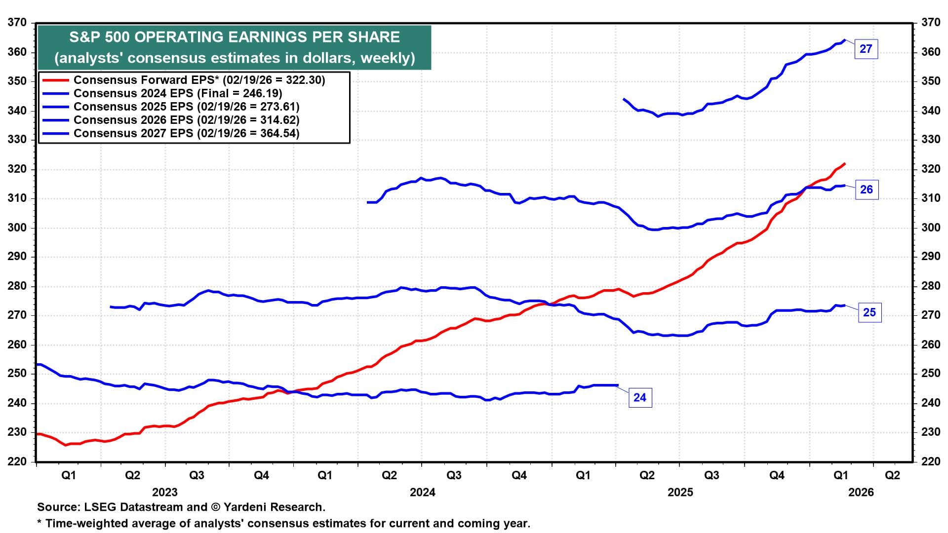 (2) Earnings. We remain bullish on the S&P 500 with our target of 7700 by the end of this year because we remain bullish on the outlook for S&P 500 earnings. Industry analysts are bullish, too. They are currently expecting earnings per share to rise to $314.62 this year (from a projected $273.61 last year) and leap to $364.54 next year (chart). We are still at $310 and $350 for this year and next, but will likely raise our targets soon after we get the final results for Q4-2025.