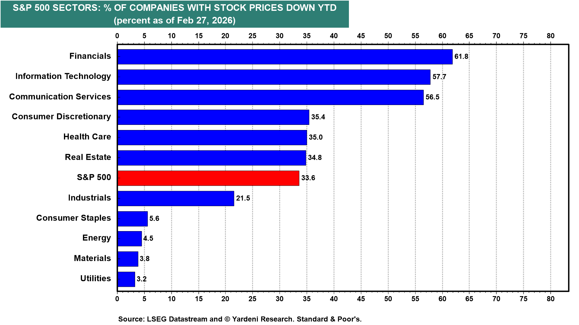 Not surprisingly, the worst (best) performing S&P 500 sectors so far this year have the highest (lowest) percentages of stock prices down ytd (chart).