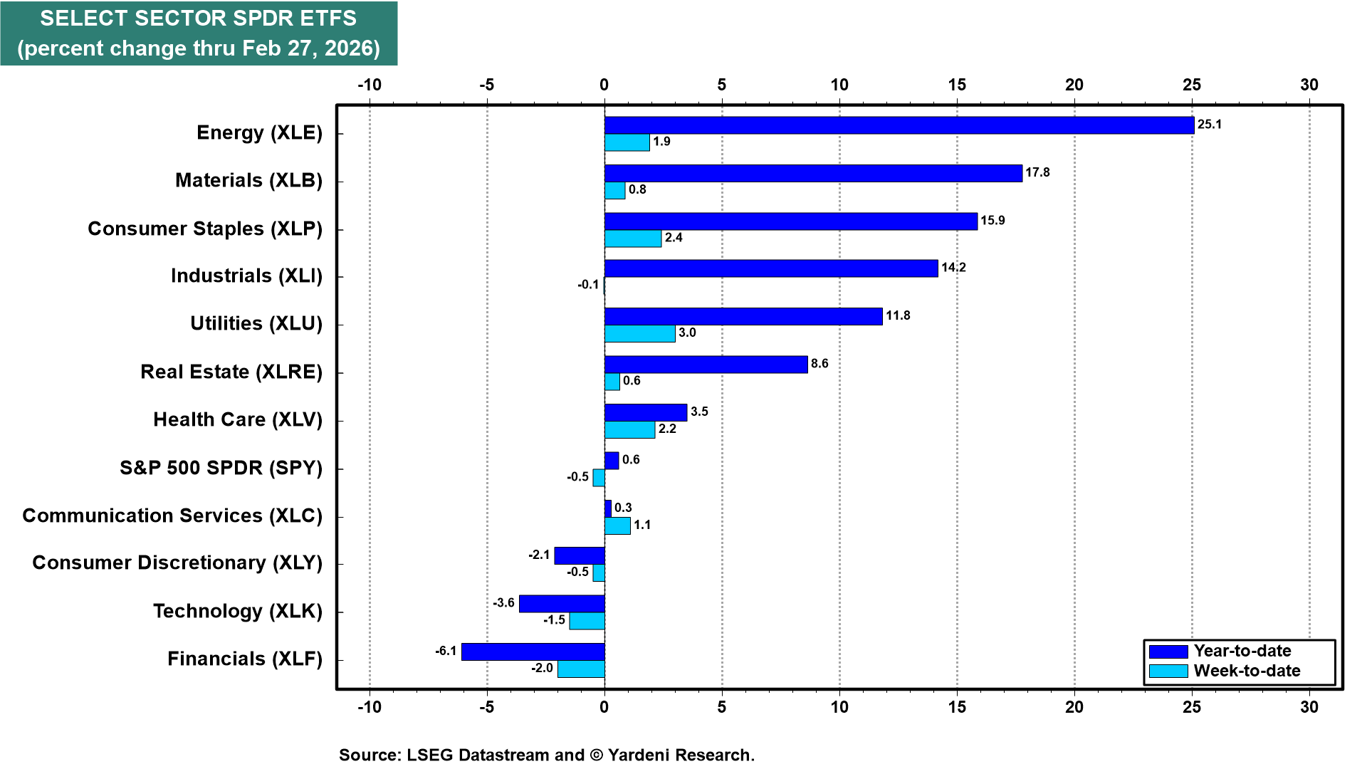 The worst performing sector of the S&P 500 ytd has been the Financials sector (chart). On February 12, we wrote: “We are dropping our overweight recommendation on Financials to market weight, while maintaining our overweights on Health Care, Industrials, and Materials (as of yesterday). We are glad that we advised underweighting the Magnificent-7 and overweighting overseas stocks in early December last year.”