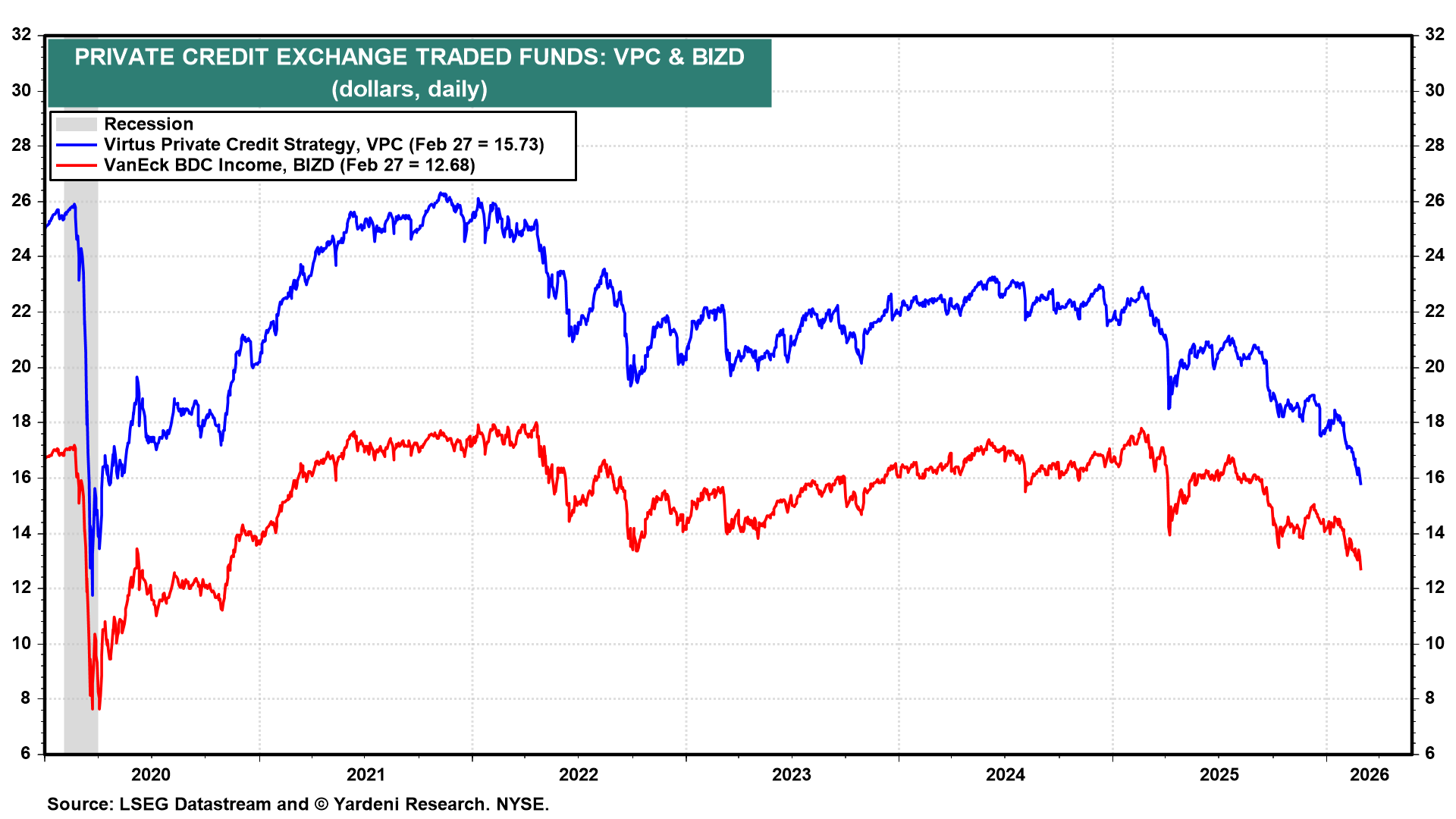 (4) Credit. The prices of private credit ETFs continue to fall (chart). This is certainly weighing on the S&P 500 Financials sector. It is a problem, but we don’t think it has the potential to cause an economy-wide credit crunch, a recession, or a bear market. But we are on guard.