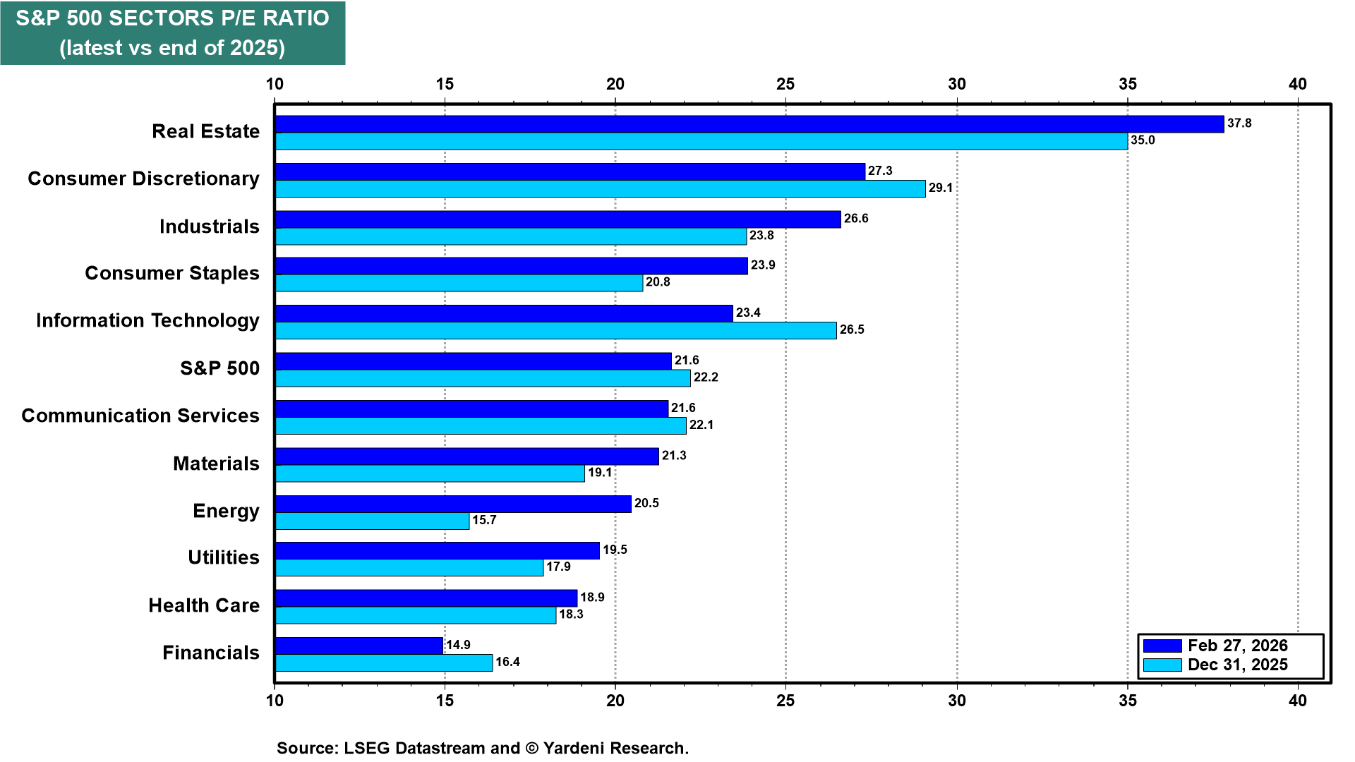 (3) Valuation. The Great Rotation of the Roaring 2020s started late last year, just as we predicted on December 7. That’s clearly visible by comparing the forward P/Es of the 11 sectors of the S&P 500 now and at the end of 2025 (chart). The valuation multiples of last year’s outperformers have come down, while those of last year’s laggards have increased. As a result, the forward P/E of the S&P 500 is only down to 21.6 from 22.2.