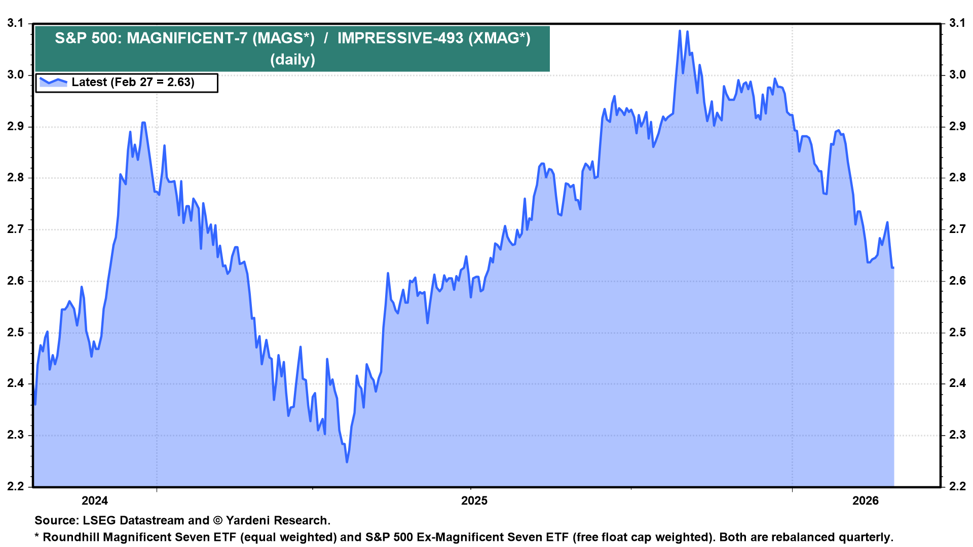 The Magnificent-7 continue to underperform the Impressive-493, as they have since late October 2025 (chart).